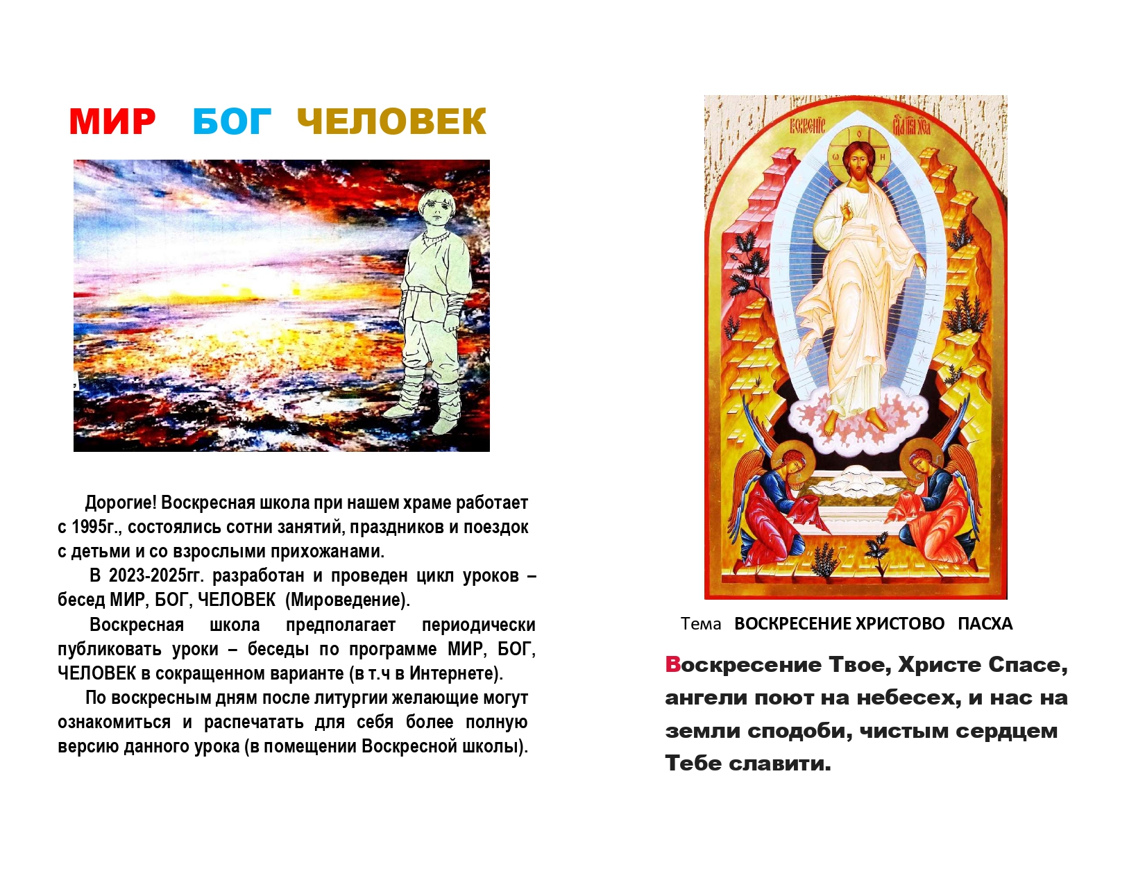 Воскресная школа предлагает периодически публиковать уроки – беседы по программе «Мир, Бог, человек» на интернет-ресурсах храма в сокращенном варианте. Печатный вариант публикуемого урока будет представлен в помещении Воскресной школы. По воскресным дням после Божественной Литургии желающие могут распечатать для себя более полную версию данного урока.