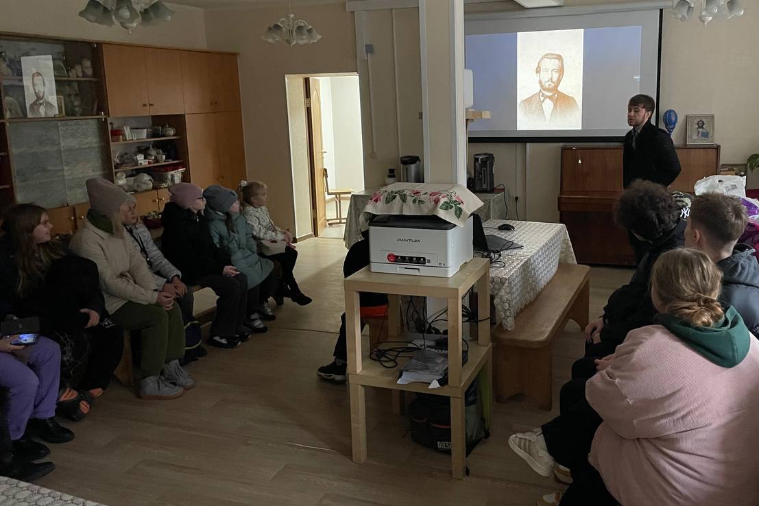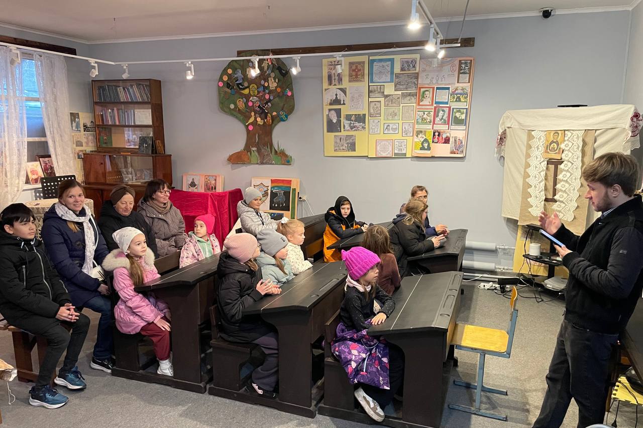 Краевед Александр Семенихин рассказал о возникновении села Захарьино, именитых владельцах этих земель, строительстве первого храма в 1648 году, его реконструкции в конце ХIХ века по инициативе настоятеля протоиерея Николая Сироткина. Маленьких посетителей более всего заинтересовал рассказ об организации здесь церковно-приходской школы, в историческом здании которой их пригласили присесть за парты Эрисмана.